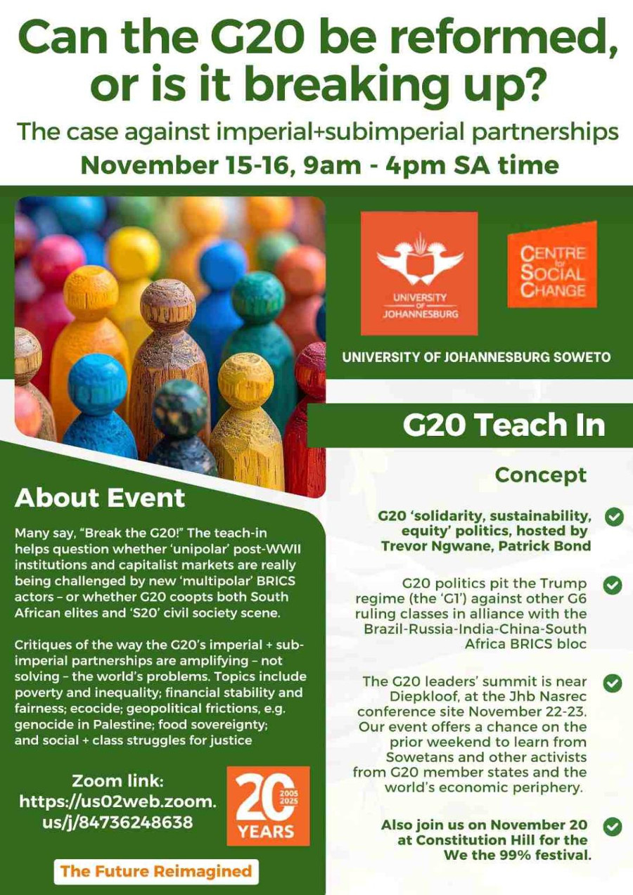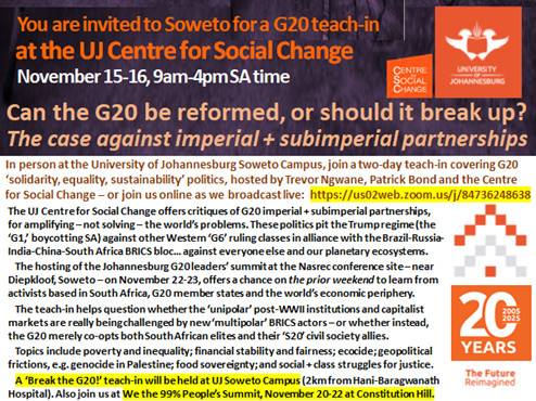 In person at the University of Johannesburg Soweto Campus, join a two-day teach-in covering G20 ‘solidarity, equality, sustainability’ politics, hosted by Trevor Ngwane, Patrick Bond, Tafadzwa Choto, Cleopatra Shezi and the Centre for Social Change – or join us online as we broadcast live: https://us02web.zoom.us/j/84736248638 The UJ Centre for Social Change offers critiques of G20 imperial + subimperial partnerships, for amplifying – not solving – the world’s problems. These politics pit the Trump regime (the ‘G1,’ boycotting SA) against other Western ‘G6’ ruling classes in alliance with the Brazil-Russia-India-China-South Africa BRICS bloc… against everyone else and our planetary ecosystems. The hosting of the Johannesburg G20 leaders’ summit at the Nasrec conference site – near Diepkloof, Soweto – on November 22-23, offers a chance on the prior weekend to learn from activists based in South Africa, G20 member states and the world’s economic periphery. The teach-in helps question whether the ‘unipolar’ post-WWII institutions and capitalist markets are really being challenged by new ‘multipolar’ BRICS actors – or whether instead, the G20 merely co-opts both South African elites and their ‘S20’ civil society allies. Topics include poverty and inequality; financial stability and fairness; ecocide; geopolitical frictions, e.g. genocide in Palestine; food sovereignty; and social + class struggles for justice. A ‘Break the G20!’ teach-in will be held at UJ Soweto Campus (2km from Hani-Baragwanath Hospital). Also join us at We the 99% People’s Summit, November 20-22 at Constitution Hill.
