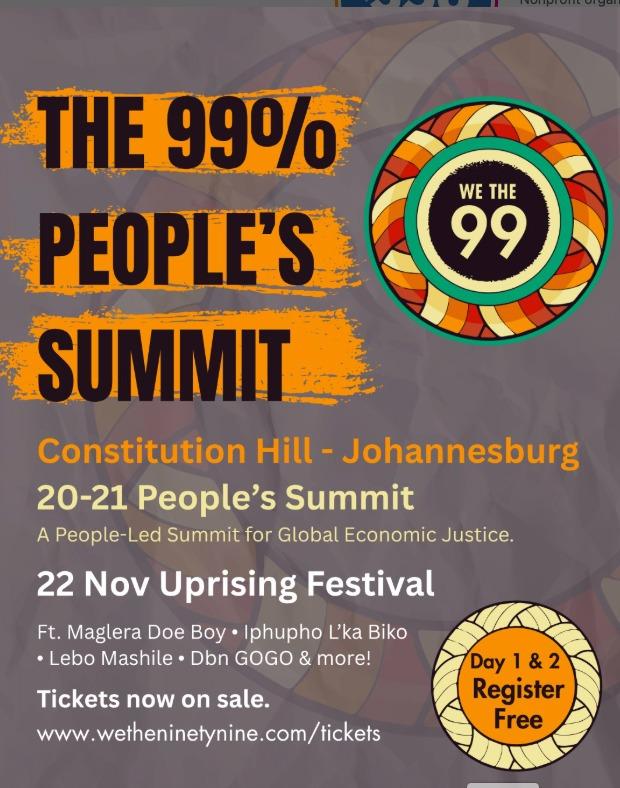The world is in a deep crisis, which is tearing apart economies, societies and the environment. We need a new global movement to get us out of this crisis. A movement that builds power from the ground up — connecting local struggles, uniting movements, and advancing clear political alternatives. In November 2025, as a counter to the G20 Leaders’ Summit for the rich, we are planning a counter-summit: a People’s Summit for global economic justice for the rest of the world’s population – the 99%. Built around the “We the 99%” call to action, the People’s Summit will unite social movements and civil society in a global effort to reclaim democracy and change the future. https://wetheninetynine.com