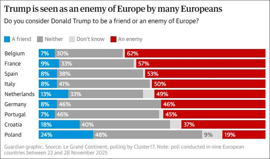 Half of Europeans see Trump as enemy of Europe, survey finds “Across the continent, Trumpism is clearly considered a hostile force,” Dormagen said, adding that this perception was hardening, with fewer people than in December 2024 describing Trump as “neither friend nor foe” and more as definitely hostile. However, Europeans still view the relationship with the US as strategically important: when asked what position the EU should adopt towards the US government, the most popular option (48%) was compromise. The survey in France, Italy, Spain, Germany, Poland, Portugal, Croatia, Belgium and the Netherlands also found a relative majority (51%) felt the risk of open war with Russia in the coming years was high, and 18% considered it very high. Dormagen said such a result “would have been unthinkable just a few years ago and signals the shift of European opinion toward a new geopolitical regime in which the possibility of direct conflict on the continent is now widely accepted”. View varied strongly according to proximity to Russia, with 77% of respondents in Poland considering the risk of war to be high, compared with 54% in France, 51% in Germany, 39% in Portugal and 34% in Italy. Confidence in national military capabilities was low everywhere, the survey found, with 69% of respondents across the nine countries saying they thought their country was “not really” or “not at all” capable of defending itself against Russian aggression. French respondents were the most confident, but it remained a minority opinion at 44%. In Poland, which shares a border with Russia, 58% were not. Dormagen said: “We are entering an age of danger while feeling a persistent sense of national weakness.” Feelings of vulnerability were widely shared, the survey found, with only 12% of respondents saying they did not feel particularly threatened by a raft of sources of insecurity ranging from technological and military to energy and food. Although there were significant national differences, tech and digital security was the most frequently cited threat (28%), then military security (25%). There was strong demand for European help, with 69% of people saying the EU should play a protective role. The vast majority of respondents across the nine countries backed EU membership: 74% said they wanted their country to stay in the bloc, with that sentiment highest in Portugal (90%) and Spain (89%) and lowest in Poland (68%) and France (61%). Five years after Brexit, the UK’s decision to leave is overwhelmingly seen as a failure: 63% believed it had had a negative impact on Britain and just 19% thought it had been positive, including 5% who saw it as very positive. www.theguardian.com/world/2025/dec/04/europeans-trump-enemy-of-europe-russia-war-poll? Back |