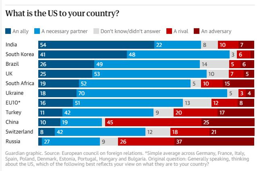 Trump is making China not America great again global survey suggests These ranged from 83% in South Africa, 72% in Brazil and 63% in Turkey through 54% in the US, 53% in 10 EU states and 51% in India to 50% in the UK. Most EU citizens expected China to soon lead the world in electric vehicles and renewable energies. Moreover, few seemed concerned about it. The polling found that only in Ukraine and South Korea did majorities view China as a rival or an adversary, while more people in South Africa, India and Brazil saw China as an ally than they did two years ago. In South Africa (85%), Russia (86%), and Brazil (73%), majorities view China either as a necessary partner or as an ally. The EU view was unchanged: 45% see China as a necessary partner. Many countries expect their relationship with China to strengthen. At the same time, while many believe the US will remain influential, outside Brazil, India, South Africa and Turkey there was no majority – including in the US itself – for the view that American influence was likely to grow any further. Amid increasingly favourable views of China, the status of the US as an ally has declined across almost all the countries surveyed, with India the only one where a majority still feels the US is an ally, sharing the country’s values and interests. As other polls have also shown, the change in perceptions of the US among EU citizens is marked: only 16% now consider the US as an ally, with a striking 20% seeing it as either a rival or an enemy. Elsewhere, perceptions of America are in decline. In most countries, too, the survey showed expectations of Trump himself had fallen, sometimes dramatically. Fewer people felt the US president’s re-election was good for US citizens, their own countries or for peace in the world than 12 months ago. The survey, the fourth in a series, was carried out with Oxford University’s Europe in a Changing World project. It suggests that with the world’s balance of power shifting, people’s perceptions of Europe are changing too – most notably in Russia. With the war in Ukraine set to enter its fifth year in February, respondents in Russia are now more likely (51%) to see Europe as an adversary than last year (41%), and less likely (37%) to consider the US as such than they were 12 months ago (48%). Ukrainians, on the other hand, are more likely to see Europe as an ally (39%) than the US (18%, down from 27% last year). Views of Europe are also changing in China, where 61% of respondents see the US as a threat, but only 19% think the same of the EU. The report’s authors, Ivan Krastev of the Centre for Liberal Strategies, Mark Leonard of the ECFR and the historian and Guardian columnist Timothy Garton Ash, said this did not appear to be because Chinese citizens did not take the EU seriously.