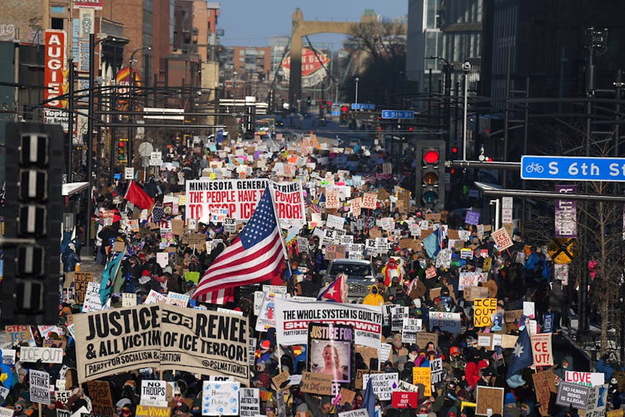 Over 100,000 protest against ICE occupation in Minneapolis The protesters’ demands include that ICE leave Minnesota, that the ICE officer who killed Good be legally held accountable, an end to additional federal funding for ICE, and for the agency to be investigated for human rights and constitutional violations. Hundreds of local businesses in Minnesota announced closures in solidarity. Thousands of people took the day off from their jobs to join the action, while others participated by not shopping on Friday. The Minneapolis city council endorsed the day of action and the general strike. The state’s cultural institutions – including the Walker Art Center, the Minneapolis Institute of Art, the Science Museum of Minnesota and the Minnesota Children’s Museum – closed on Friday as well. During a protest at the Minneapolis-St Paul airport on Friday morning, hundreds of clergy members called for an end to the ICE surge and urged airline companies to join them in opposing ICE in the state. Video of the action showed hundreds of people walking outside the airport in sub-zero temperatures, singing songs and praying together. Deportation flights go in and out of the airport daily. On Friday afternoon, thousands clad in winter gear and carrying signs filled the streets of downtown Minneapolis to march in subzero temperatures, ending in a rally inside the Target Center, an arena downtown. “We are going to be having dangerously cold weather on Friday – -10F with wind chills. Like the high is going to be -10F with wind chills of up to -20F,” Chelsie Glaubitz Gabiou, president of the Minnesota Regional Labor Federation, AFL-CIO, had told the Guardian earlier. “We are a northern state, and we are built for the cold, and we are going to show up, but folks are going to need to pay attention to not just the march, but what people are doing, the individual stories of solidarity that people are going to be doing.”